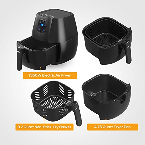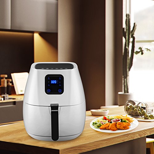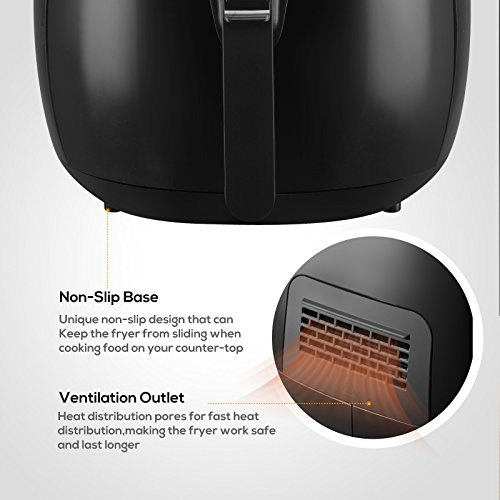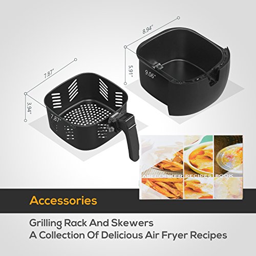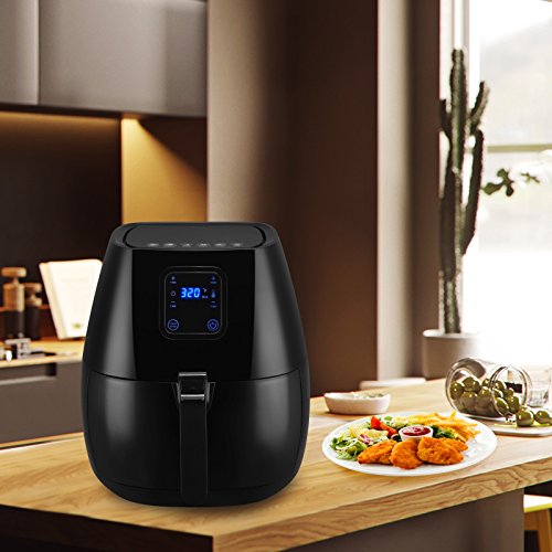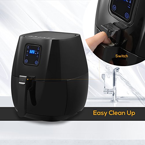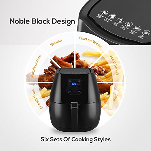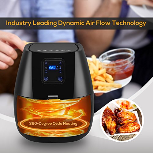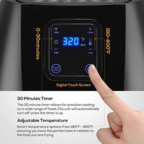 ★Feature Advanced Touch Screen Menu-KUPPET hot air fryer features built-in touch screen menu featuring 6 cooking presets:Fries/Chips,Potato, Chicken Wings, Meat String, Ribs and Shrimp.Equipped with a wide temperature range from 180F to 400F and a cooking timer up to 30 minutes. This air fryer can feed a family of 3 to 5.