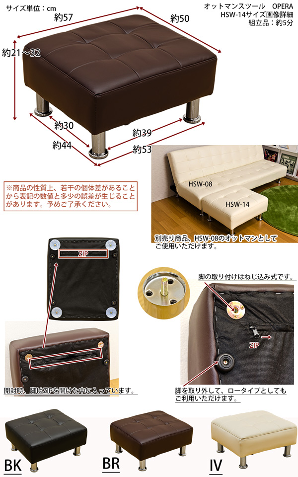 本商品はお取り寄せ商品のため、稀にご注文入れ違い等により欠品・遅延となる場合がございます。誠に恐れ入りますが、何卒ご了承ください。 また、以下の場合には追加送料がかかる場合がございます。  ・大型商品の複数購入時 ・同梱区分が異なる商品の複数購入時  【出荷目安】:1 - 4営業日 ※土日・祝除く 【同梱区分】:TS 1490 【梱包サイズ】:大型商品 【代引き決済】:不可  配送伝票の依頼主は出荷元(メーカーもしくは仕入元)名となる場合がございますので、お受け取りの際はご注意ください。   【型番】HSW14  【商品名の色やサイズについて】 こちらは「オットマンスツール/ロースツール OPERA 張り地:合成皮革(合皮) 高さ21~32cm ブラウン(茶)」の商品ページです。商品画像や商品情報には、色違いやサイズ違いの商品が載っている場合がございます。ご注文前に色・サイズ・セット内容のご確認をお願いいたします。  大人気のコンパクトソファベッド OPERA(別売り)に合わせられるオットマンスツールです オットマンスツールのみの商品ページです イメージ画像は別売りのソファと合わせてご購入いただいた場合の画像です ご注意下さい  脚は取り外しが出来ますので、脚を取り付けなくてもロ-タイプとしてご使用いただけます 【ご注意】 脚は裏面に入っています ZIPを開けて取り出して下さい  張り地はPVCなので、布と違って汚れても拭き取りが楽です 中材にSバネを使用していますので、へたりにくくなっています  ブラック(BK)、ブラウン(BR)、アイボリー(IV)の3色展開です  幅570×奥行500×高さ210~320mm(梱包サイズ:幅600×奥行510×高さ220mm) 本体重量:5.1kg(梱包重量:6.5kg) 組立式(脚をネジ込むのみ/約5分)1梱包 張り地:合成皮革(PVC) 中材:Sバネ、ウレタンフォーム 脚:スチール、プラスチック  原産国:中国  【ご注意事項】 ※本商品は、北海道・沖縄・離島への配送はいたしかねます。あらかじめご了承ください。