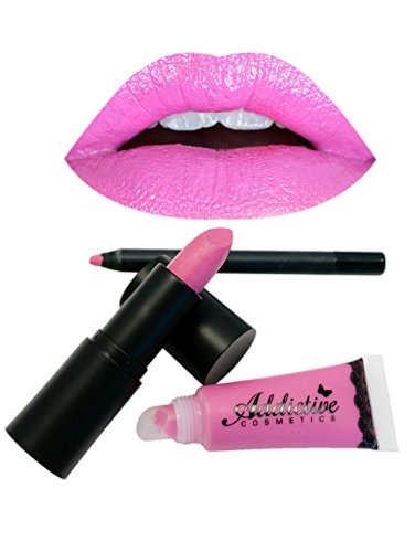 Hot Pink Lipstick, Lipliner and Lip Gloss Set by Addictive Cosmetics- All Natural Organic Lipstick, Liner and Lip Gloss Set- Vegan Friendly and Cruelty Free Cosmetics- Made in the USA- 80'S BABY