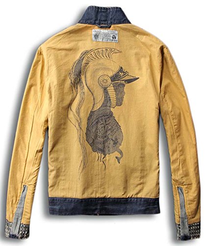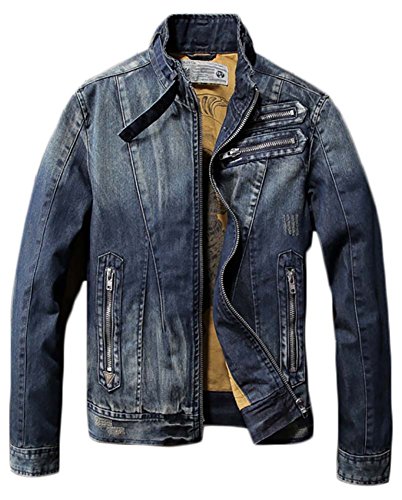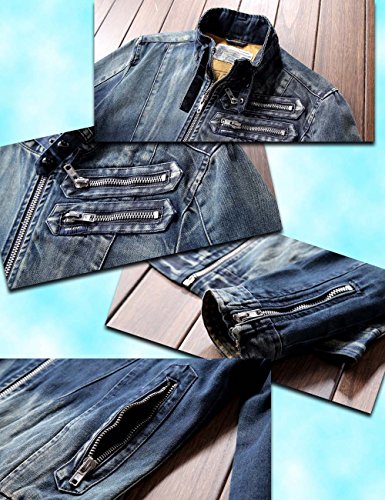 -. Feature : ベルト付きのスタンドカラーがとってもオシャレな、大人の男のデニムジャケット。 / ヴィンテージ感漂う風合いとさりげないダメージ加工がたまりません。アシンメトリーに配置されたジッパーが程よくハードなイメージをプラス。クールな一着に仕上がっています。(※左胸のファスナー2つはダミーです。ポケットではありません。) / 裏地は落ち着いたマスタードカラーで、中世ヨーロッパを思わせるプリントが素敵です。着用時はもちろん、脱いだ時のオシャレにもぬかりありません。 / 定番アイテムで着回し力抜群ながら、ワンランク上のスタイルに決まる事間違いなし! デイリーに大活躍の、おすすめアイテムです!! / サイズ:M~3XL/素材:綿90%/中国製。記載のサイズは実寸と誤差があることもあります。ご了承ください。/※小さめな作りなので、1サイズ上をお勧めしております。適度な余裕をお求めの際には、2サイズ上のサイズをお勧めいたします。