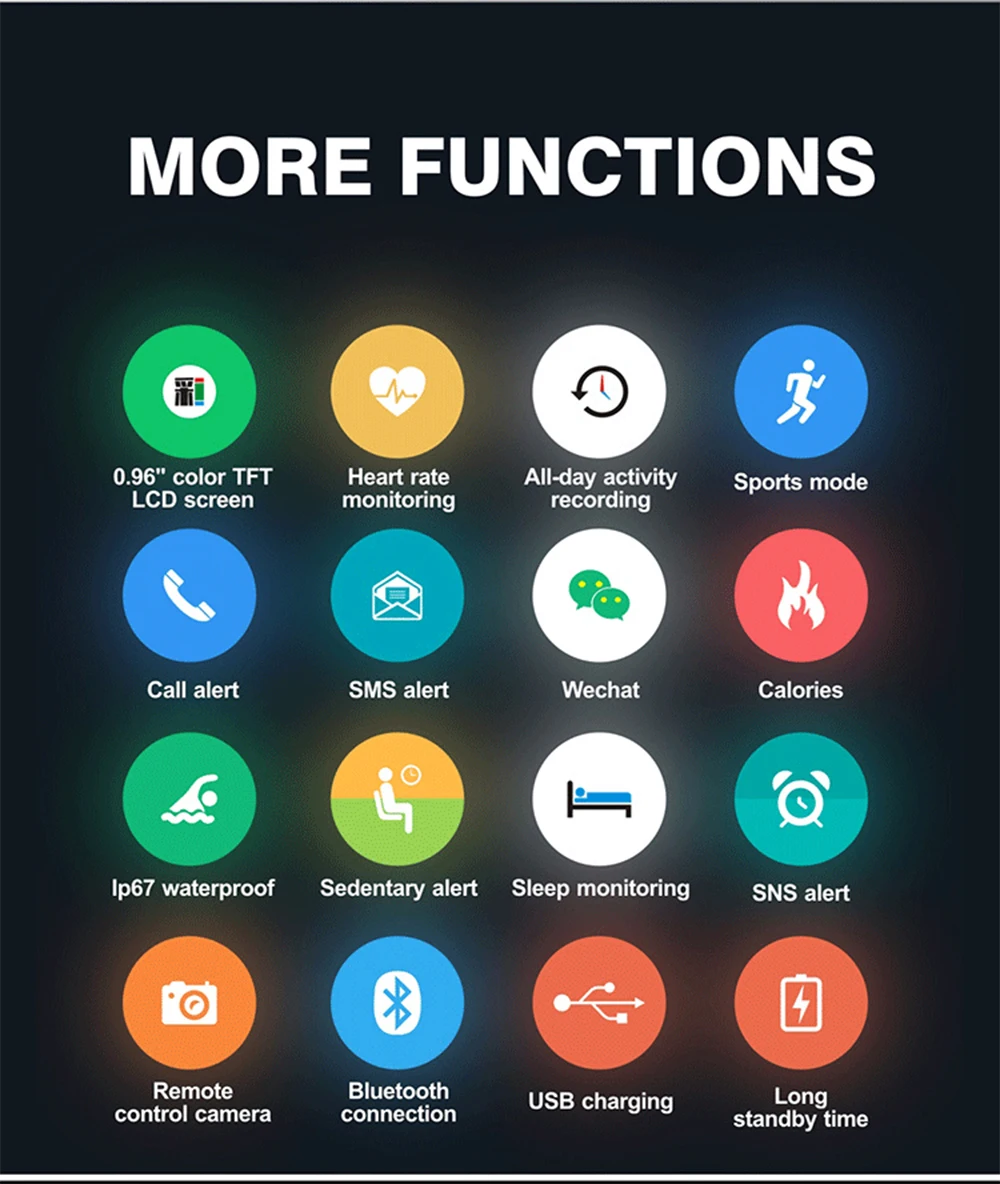 Function:Week,Message Reminder,Passometer,Alarm Clock,Fitness Tracker,Call Reminder,Remote Control,Sleep Tracker,Heart Rate Tracker,Push Message