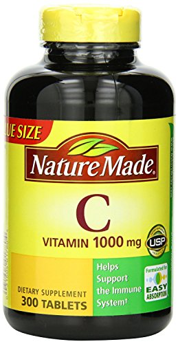 Bottle of 300 vitamin C tablets for immune system support, each tablet containing 1,000 milligrams of Vitamin C