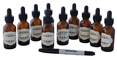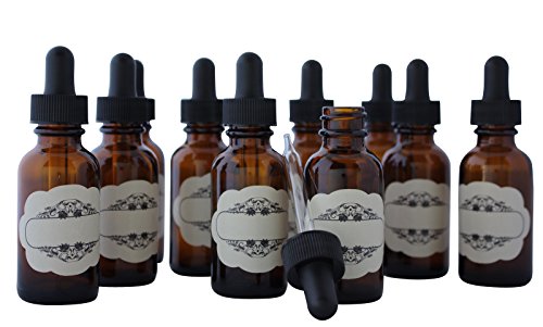 1 Oz (30 ml) Amber Glass Bottles Boston round with glass eye dropper 10 pack + Include colored rectangle labels for easy identification