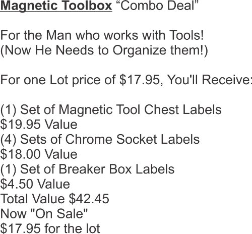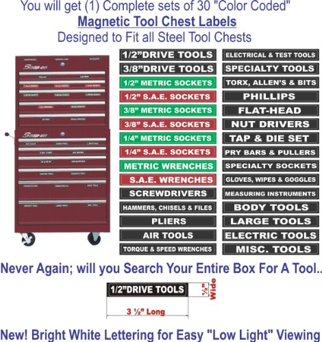 - Feature : Magnetic Tool Box "Combo Deal" / 7 helpful Preprinted Label Sheets / (1) Magnetic Tool Box Set / (4) Chrome Socket Label Sets / (1) Breaker Box Set
