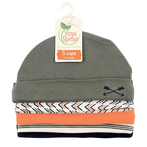 Yoga Sprout features fun, comfortable athletic wear with vibrant colors and playful patterns. This adorable 5 pack caps feature super soft 100 percent cotton fabric. Caps are perfect to keep baby warm during warmer months, or to wear out and about! fits up to 6 months. Mix and match additional garments from our coordinating elephant collection! from happy baby pose to every day adventures, grow, relax and be happy, with Yoga Sprout