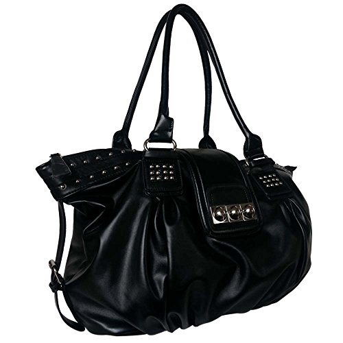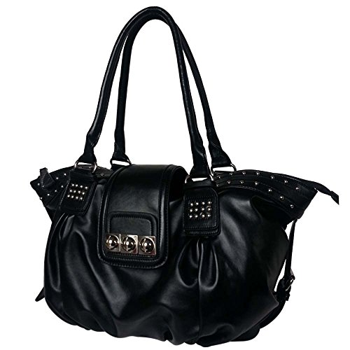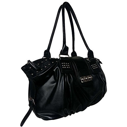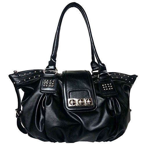 Get ready to be inspired by this gleaming Metal Studded Soft Leather Hobo Style Shopper Top Handle Handbag. The Metal studs detailing and the leatherette exterior, adds-up to the razzle-dazzle of this amazing handbag. It has 3 bullet studs embellished on the magnetic flap with zippered closure keeping your daily essentials secure, while a rear zippered exterior wall pocket offers easily access to small essentials such as coins, house or car keys. The spacious main compartment opens to a fully interior lining that features 2 open top pockets and 1 zippered pocket. This handbag is made using smooth and soft textured faux leather. Carry it wherever you go and look glamorous.
