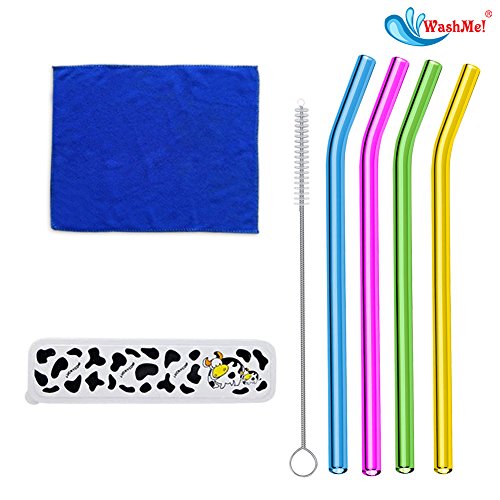 4 Colorful WashMe Glass Drinking Straws with Cleaning Brush: Eco-Friendly, Ergonomically Bent, BPA-Free & Reusable: Rust-Proof, Scratch-Proof, & Dishwasher Safe: Odor-free Experience at Home or bar