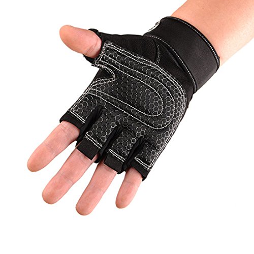 -. Feature : Size:M/L/XL / High quality nylon mesh cloth is highly elastic ,moisture wicking, lightweight, and breathable. / Anti-wear and Anti-skid microfiber in the palm part helps to reduce road vibration and relieve hand fatigue, well protect against impact and abrasion. / Finger pulls for easy removal, velcro handcuffs provides comfort and allow for fit adjustment. / Provides comfort, control and better grip for all types of weight training exercises.