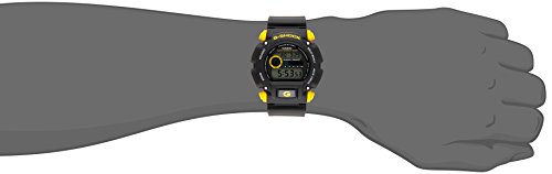Round shock-resistant digital watch with electro-luminescent backlight, yellow pushers, and daily alarm