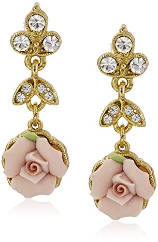 Downton Abbey Boxed Gold-Tone Pink Porcelain Rose and Crystal Drop Earrings
