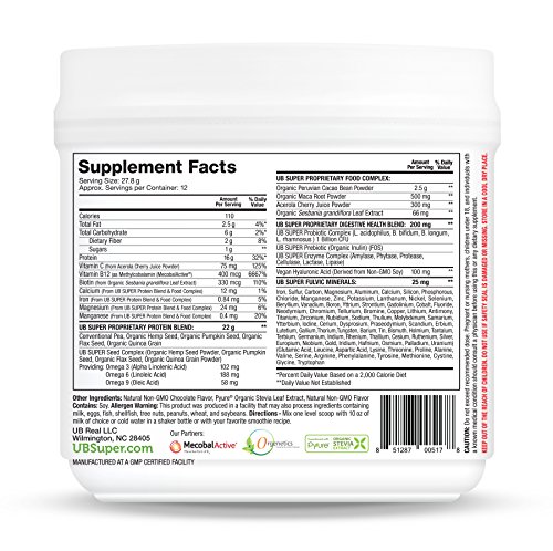 -. Binding : Health and Beauty -. Brand : UB Super -. Color : Chocolate -. EAN : 0851287005178 -. Feature : Every UB Super Plant Based Protein Smoothie contains Protein, maca root, fulvic minerals and B vitamins for Sustainable Energy / Acerola cherry, pre/probiotics, fulvic minerals, and cacao* for Immunity and Antioxidant protection / Vegan hyaluronic acid, biotin, and fulvic minerals for Skin, Hair, Nails and Jointsupport / This protien powder mix has high-quality protein and fiber for Recovery, Repair and Healthy Weight and Meal Management / B12, pre/probiotics, digestive enzymes, and fulvic minerals for Digestion and Cognitive Health -. IsAdultProduct : 0 -. Label : Full Circle Supplements -. Manufacturer : Full Circle Supplements -. MPN : 851287005154 -. PackageQuantity : 1 -. PartNumber : 851287005154 -. ProductGroup : Health and Beauty -. ProductTypeName : HEALTH_PERSONAL_CARE -. Publisher : Full Circle Supplements -. Studio : Full Circle Supplements -. Title : UB Super Plant Based Protein Smoothie - Powder Mix Dietary Supplement (Chocolate) -. UPC : 851287005178