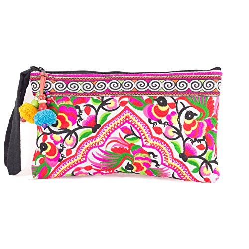 -. Feature : Material : Cotton, Fabric, Zip / Fabric : You may not receive the exact bag picture here, As the fabric design may very slightly from bag to bag. So you can see the small difference between them. One of kind fabrics with their unique embroidery by its artisan. / Zip : This bag has an outside zip closure and inside pocket with zip. / Zip : Two pompoms on zip. / Length:11" (INCH), 28.5cm Height:6" (INCH), 16cm Handler:5.5" (INCH), 14.5cm
