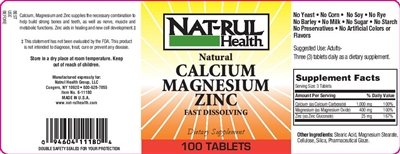 Studio : Nat-Rul Health Publisher : Nat-Rul Health Binding : Health and Beauty Product Description Calcium, Magnesium and Zinc supplies the necessary combination to help build strong bones and teeth, as well as nerve, muscle and metabolic functions. Zinc aids in healing and new cell development.‡ ‡ This statement has not been evaluated by the FDA. This product is not intended to diagnose, treat, cure or prevent any disease. No Yeast ? No Corn ? No Soy ? No Rye No Barley ? No Milk ? No Sugar ? No Starch No Preservatives ? No Artificial Colors or Flavors 0