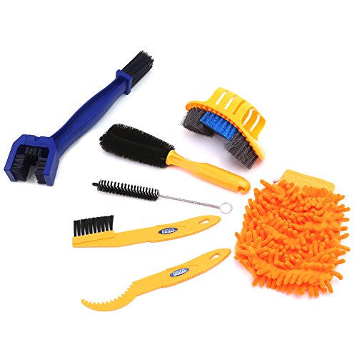 - Compact – Including 7 different Cleaning Brush and Tool: Chain Brush,Tire Scrubber, Tarpered Detail Brush, Wheel Brush, Sprocket Scraper, Sprocket Brush and a Bike clean mitt. Only 8oz weight, compact, and easy to carry.