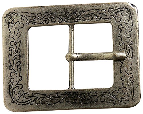 - Metal buckle with an antique silver finish, rectangular buckle with embellishment, buckle with floral pattern