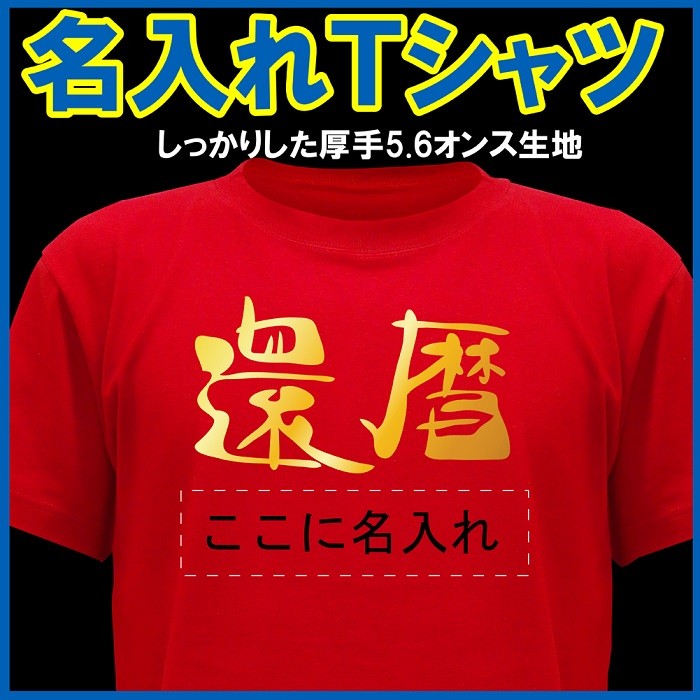 高品質しっかりとした厚手生地5.6オンスの赤Tシャツに豪華金文字で「還暦」の大きな文字! しかも、この価格でお名前やお好きな文字を8文字まで名入れします!! お客様に当店シャレもん の品質を知っていただく為のお試し価格ですので、いつ値上げするかわかりません(笑)是非このチャンスに!! デザインがお揃いの還暦パンツもあります! 他にも還暦商品が数十種ありますので、全身還暦グッズでお父さんを還暦マンに変身させましょう! きっと、喜び・・・はい、みんな爆笑に包まれることでしょう!! 本当にオススメ!!!!