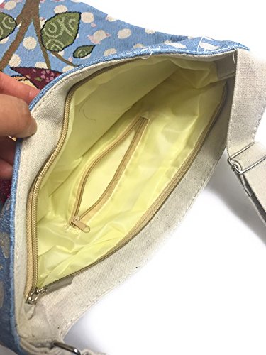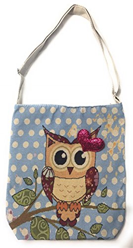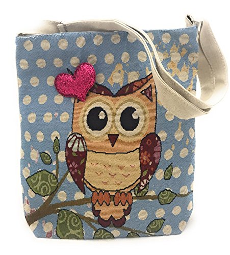 Owl On a Tree Blue Canvas Eco Bag with a Red Heart Brooch