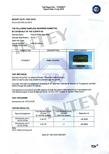 Test Specifications: INTEY outdoor water filtration filter was tested and approved by German TUV SUD Institute to remove Bacteria, Staph, and Virus (Phi X174) to 99.9% and also easily eliminates Giardia, Protozoa and Parasites from the water.