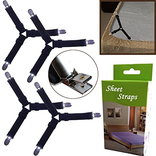 - 4, BSLINO BED SHEET SUSPENDERS STRAPS: Life savers! These Cover Fasteners easy to put on, keeps corners in place, Hold sheets tight all night long, keep your bed looking great at all times, Never worry about messy or wrinkled sheets again. Make your life easier; tablecloth clips; Ironing Board Cover Fasteners; fitted sheet holder,bed sheet holder straps,bed sheet corner clips grippers straps,adjustable elastic sheet straps grippers,sheet fasteners;Sheet suspenders in outdoor recreations