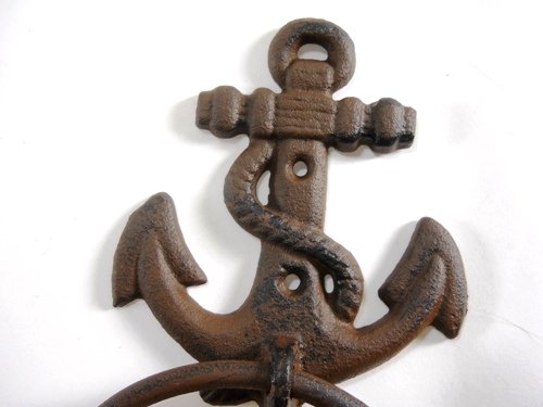 Cast iron anchor towel ring measures: cast iron anchor towel ring. Great for the boating enthusiast. Measures 4 5/8"W X 8 5/8"H X 1 1/8"D.