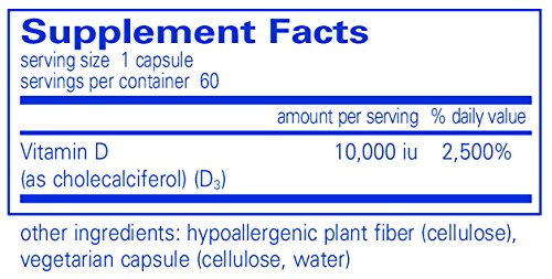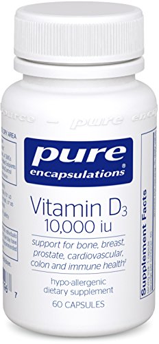 -. Binding : Health and Beauty -. Brand : Pure Encapsulations -. Feature : Essential vitamin for absorbing and using calcium in the diet / Supports all-over bone, cardiovascular, neuromuscular, and immune health / Appropriate supplementation of vitamin D3 (Cholecalciferol) and calcium may reduce the risk of osteoporosis / Easily digested due to its dry, water-soluble preparation and natural vegetable coating / Pure Encapsulations' products may only be shipped within the United States -. Label : Pure Encapsulations -. Manufacturer : Pure Encapsulations -. ProductGroup : Health and Beauty -. ProductTypeName : HEALTH_PERSONAL_CARE -. Publisher : Pure Encapsulations -. Studio : Pure Encapsulations -. Title : Vitamin D3 10,000 i.u. by Pure Encapsulations
