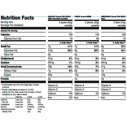 -. Feature : This 37.5 ounce Variety bag includes 80 pieces: M&M's Milk Chocolate, Twix and Snickers Bars.Individually wrapped for long lasting freshness! / Contains M&M's Milk Chocolate, Twix Caramel and Snickers Original / Perfect for sharing and handing out to trick-or-treaters! / Mars Chocolate Favorites variety bag / Kosher