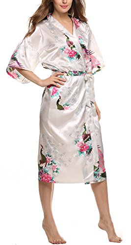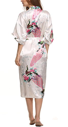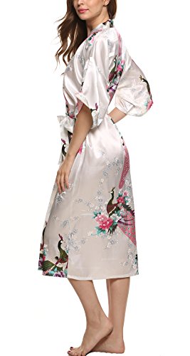 Avidlove Women's Robes Peacock and Blossoms Kimono Silk Nightwear Long Style Style1--White (FBA) Medium