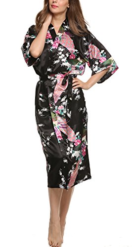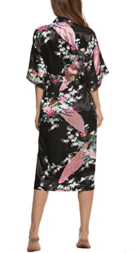 Avidlove Women's Robes Peacock and Blossoms Kimono Silk Nightwear Long Style Style1--Black (FBA) Medium