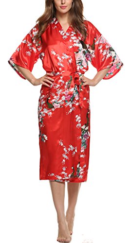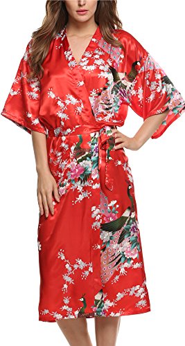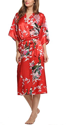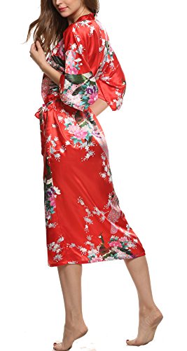 Avidlove Women's Robes Peacock and Blossoms Kimono Silk Nightwear Long Style (M = US S, Style1--Red (FBA))