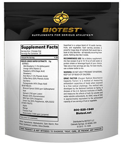 -. Binding : Health and Beauty -. Brand : Biotest -. EAN : 0648930001881 -. Feature : Superfood is a highly innovative, exotic, one-of-a-kind blend of 18 berries, fruits, and vegetables. Nothing else like it exists. Nothing about it is "off the shelf." It's very potent and highly effective at delivering a gigantic profile of nutrients that would take decades to begin to understand and a book to fully describe - all naturally occurring from plants. -. IsAdultProduct : 0 -. Label : Biotest LLC -. Manufacturer : Biotest LLC -. Model : superFood -. MPN : 296 -. PartNumber : 296 -. ProductGroup : Health and Beauty -. ProductTypeName : HEALTH_PERSONAL_CARE -. Publisher : Biotest LLC -. Studio : Biotest LLC -. Title : Biotest® Superfood Blend of 18 Berries, Fruits, and Vegetables (140 g) Freeze-Dried Super Concentrated Extracts -. UPC : 648930001881