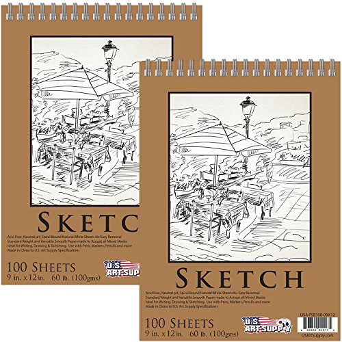 U.S. Art Supply 9" x 12" Premium Spiral Bound Sketch Pad, Pad of 100-Sheets, 60 Pound (100gsm) (Pack of 2 Pads)