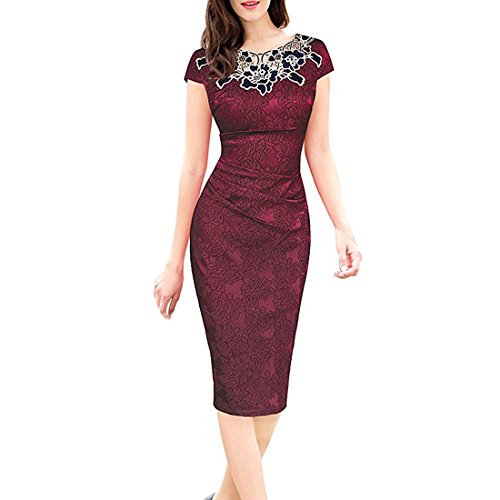 -. Feature : Slightly stretchy dobby fabric(95% Polyester+ 5% Spandex), Concealed zipper at back / Hollow out floral round neckline with embroidered lace, Cap sleeve/Long sleeve, Sexy backless v back / Ruching detail in the middle, Lovely decals roses solid P.R.Inting in front and sleeves, Slightly stretchy in back, adjustable for different body types and shape it well. Patchwork dress, Different fabric in front and back / Figure flattering, Form fitting, Knee length dress, Classy and elegant sheath pencil dress / Floral Applique Bodycon Dress suits for Cocktail, Evening, Wedding, Prom, Party, Formal, Business work, Casual and other occasions