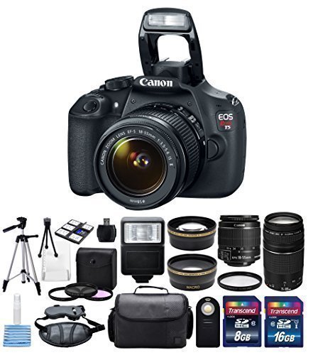 -. Feature : For gorgeous, high-quality photos and videos take a look at the Canon Rebel EOS T5 DSLR Camera. With US Warranty and DIGIC 4 image processor for exceptionally clear, vivid and sharp pictures and striking results / This Canon EOS rebel T5 Kit is paired with Canon EF-S 18-55mm f/3.5-5.6 IS II (Image Stabilizer) Lens and the & Canon EF 75-300mm f/4-5.6 III Lens along with Pro Series HD 58mm wide angle Lens + 58mm 2.2x High Definition Telephoto professional Lens. / This kit Contains a 3 Pc. digital filter set with a premium quality UV filter to reduce glare and prevent damage without affecting color balance as well as circular polarizer filter to reduce metallic and water glares and fluorescent filter to reduce green casts. / Take more high resolution pictures with the Transcend 16 GB, 8 GB SDHC class 10 flash memory card and a aluminum alloy non-slip tripod stand for crisp video and photo shoots plus a sturdy and comfortable camera bag / Also comes with a universal wireless remote controller for ease of use and versatility, a professional wrist grip strap, Camera flash and a deluxe starter kit with a 6pc memory card storage case and cleaning and maintenance tools