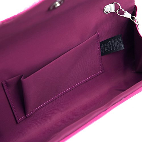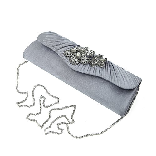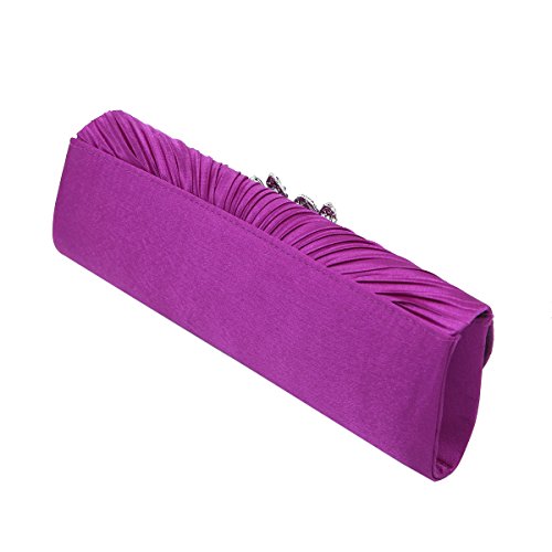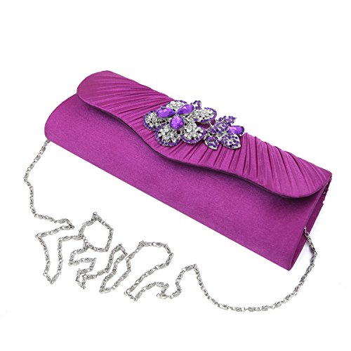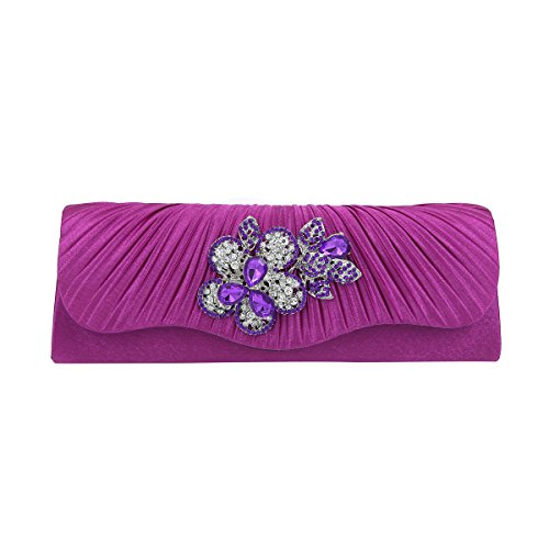 This premium quality evening clutch is both elegant and stylish. Pleated satin fabric front with chic sparkling crystal rhinestone flowers. Fully lined with magnetic-flap closure and inner wall pocket. Removable hideaway shoulder chain strap with 22" drop. Stunning, functional and versatile. The size is 10" (L) x 3.5" (H) x 2.25" (W). Elegant design and luxury feel. A must have accessory for the perfect night out.Feature