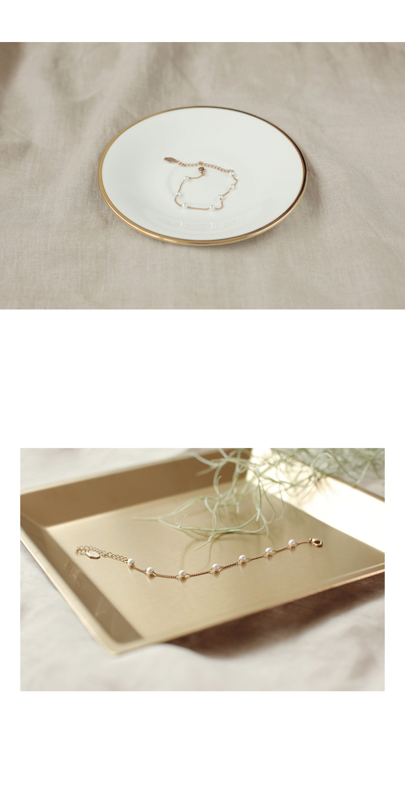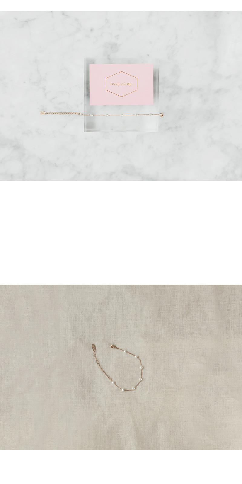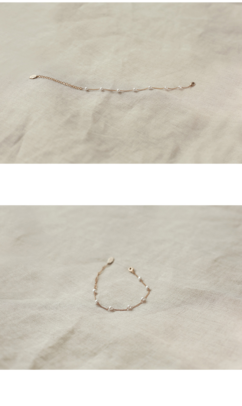 얇은 체인 간격마다 진주 포인트가 들어간 팔찌입니다.