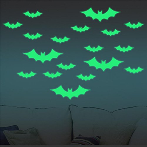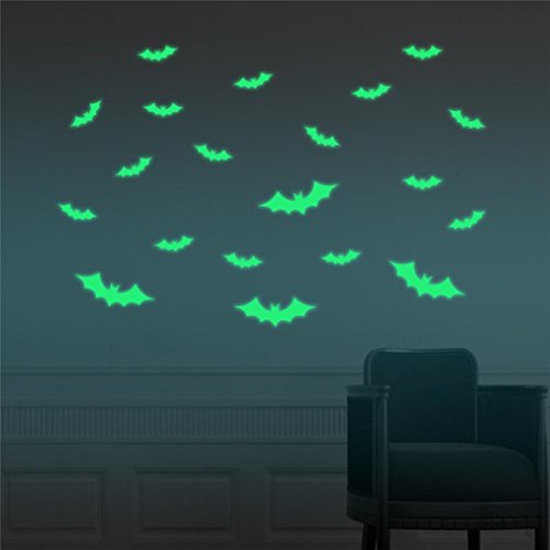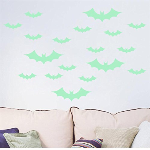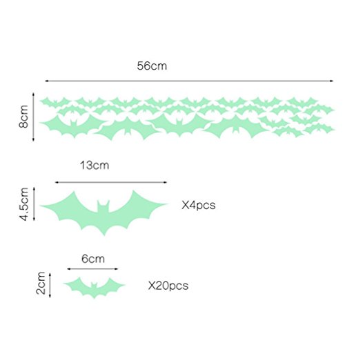 -. Feature : It will glow automatically at dark / Non-toxic, environmental protection, waterproof / 100% brand new and high quality. / Can be applied to any smooth surface, such as wall,glass door, window pane, ceramic tiles in kitchen or bathroom, home appliance, air-condition, and car body / Package Content: 4 pcs big bat Stickers 20 pac small bat Stickers