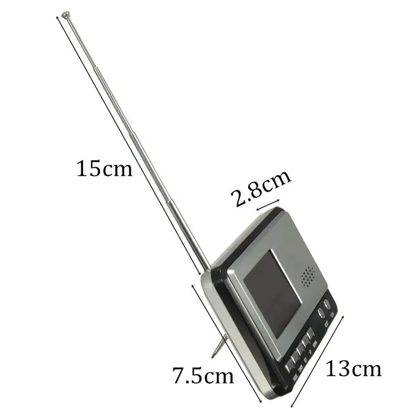 Specificatio n: 1.Model: XM-810 2.Color: Silver+Black 3.Product Size: 13 x 7.5 x 2.8cm 4. Antenna Length: 15cm 5.Display Type: Digital 6.Time Display Range: 1900-2099 7.Temperature Setting Range: 0 to 50℃ 8.Timer Setting Range: Hours From 23:00-00:00; Minutes From 59-0; Seconds From 59-0 9.Power Supply: 2x AG13 1.5V Battery(For Calendar, Include); 2x AAA 1.5V Battery (For Radio, Not Include) 10. Material: ABS (Acrylonitrile Butadiene Styrene Copolymers), Plastic