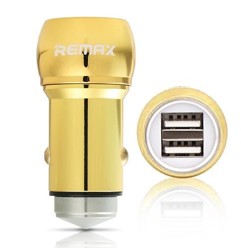 -. Title : Remax Dual USB Car Charger, 2 Port Adapter with Escape Emergency Safety Hammer Function for iPhone iPad iPod Android Smartphone Gold