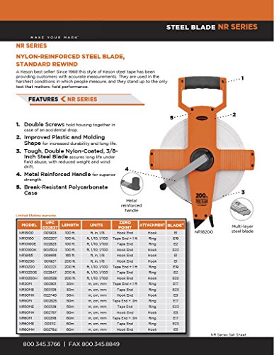 Keson NR10100H Nylon Coated Steel Blade 100-Foot Measuring Tape In Tenths, Zero Point At Tape End, Hook End