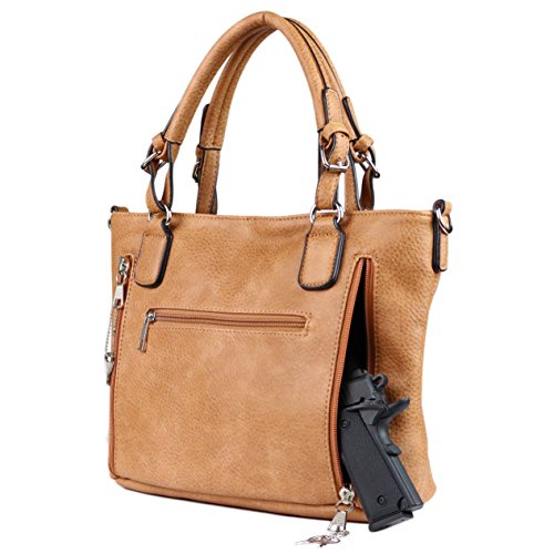 -. Brand : Lady Conceal -. Department : womens -. Feature : PREMIUM DISTRESSED FAUX LEATHER - Supple distressed faux leather / versatile carrying options - round handle or optional cross-body adjustable strap measures 34"- 45" (drop 17" - 22") / quality silver-tone hardware / SPACIOUS INTERIOR - Top zipper access / fully lined 100% satin / features two open slip pockets and a large zippered P.R.Ivacy pocket / interior lanyard with swivel snap for keys / YKK LOCKING CONCEALMENT - Dual sided (ambidextrous) / locking YKK zippers with 4 keys / includes universal holster / concealment pocket measures 9" W x 6.25" H / 100% SATISFACTION GUARANTEED - If for ANY reason you are completely satisfied, we will refund 100% within 30 days. No questions asked. / IDEAL SIZE - Not to large, not too small 12" W x 9.5" H x 5" D -. ProductGroup : Shoes -. ProductTypeName : HANDBAG -. Size : Medium -. Title : Concealed Carry Purse - YKK Locking Ella Braided Concealed Weapon Tote by Lady Conceal