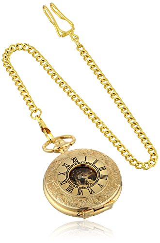 -. Feature : Gold-tone pocket watch featuring white dial with Roman numeral hour markers, center skeleton cut-out, and chain with belt clip / Mechanical hand-wind movement with analog display / Protective mineral crystal dial window / Features engraved front and back covers that open to display skeleton movement / Not water-resistant