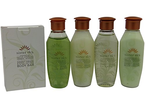 -. Feature : 1 1oz bottles of Sister Sky Sweet Grass Shampoo / 1 1oz bottles of Sister Sky Sweet Grass Conditioner / 1 1oz bottles of Sister Sky Sweet Grass Lotion / 1 1oz bottles of Sister Sky Sweet Grass Body Wash / 1 1.5oz bars of Sister Sky Sweet Grass Exfoliating Soap