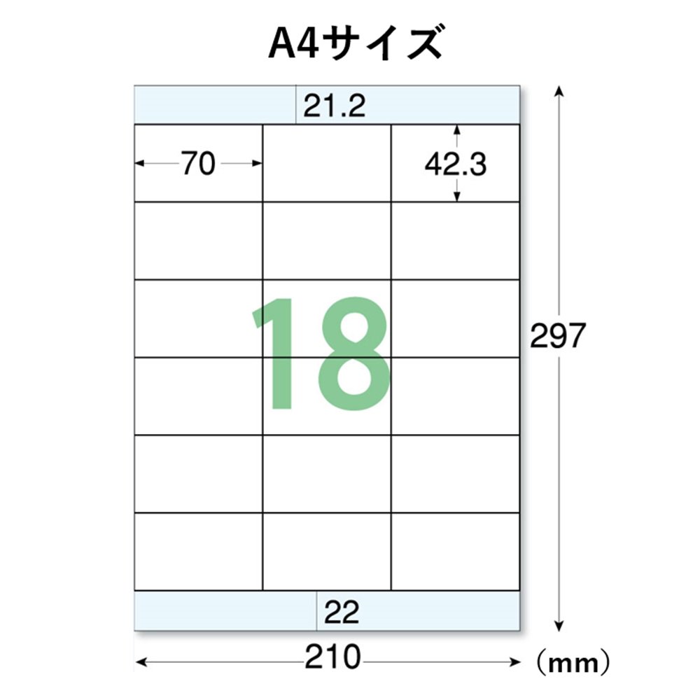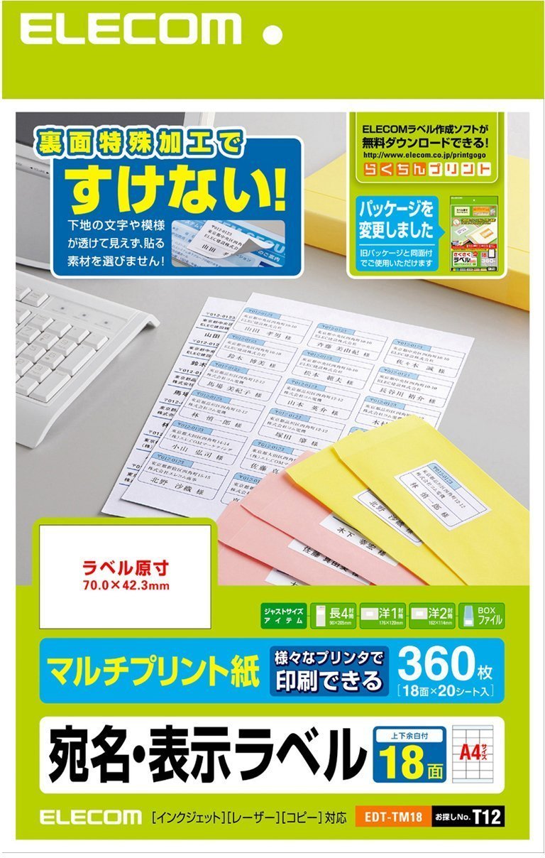 プリンタ-を選ばないマルチプリント用紙採用。 長4、洋1、洋2封筒の宛名ラベルやBOXファイルの分類ラベルに最適。 お探しNO、T12 面つけ数は18面になります。 坪量143g/m 紙厚167μmm 上下余白付 ラベル粘着面に加工を施すことにより、下地が透けず貼る場所を選びません。 EDT-M18と同じ面付けですので、同じデ-タ-を利用できます。