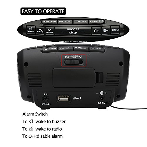 - Sleep Timer And Conveniently DST Button : Fall asleep to the radio using the programmable sleep timer (10-90 minutes). 12 Hr system with PM indicator . Extra DST function will save your time without start over to set time when in summer and winter time . Press DST button till the DST indicator light up , the hour will go forward 1 hour , light off hour will back forward 1 hour , simple as that.
