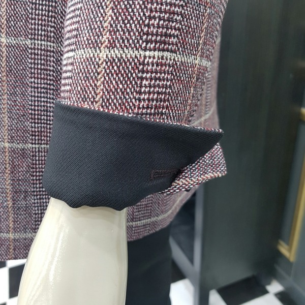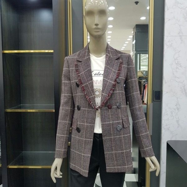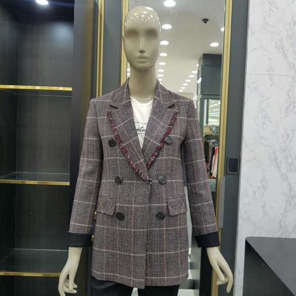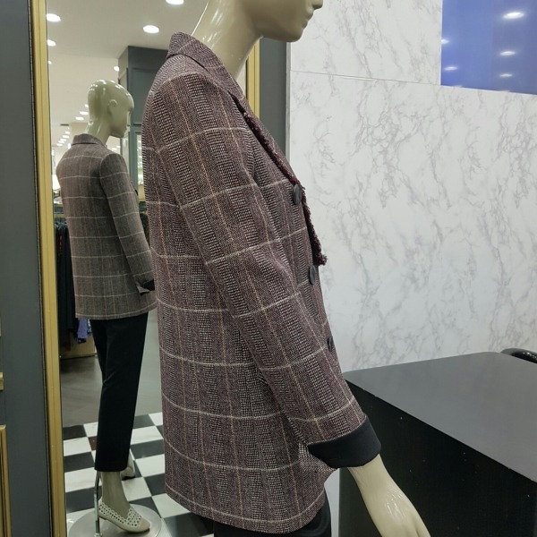 카라 부분에 수슬 장식이 되어 있는 반더블 체크자켓입니다