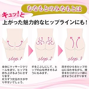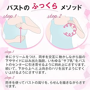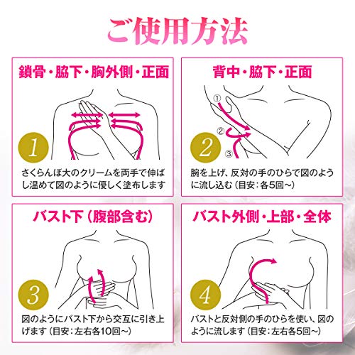 ①”さくらんぼ大”の量のクリームを両手のひらで”柔らかく”のばし”温め”て”鎖骨~脇下~胸外側”から正面に向かって優しく塗布します。