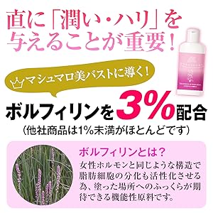 主要成分の”「ボルフェリン」”を初め、”「トリプルセラミド」”「ヒアルロン酸」”「プラセンタ」””「ホホバ種子エキス」”など”バストに嬉しい成分”を配合!
