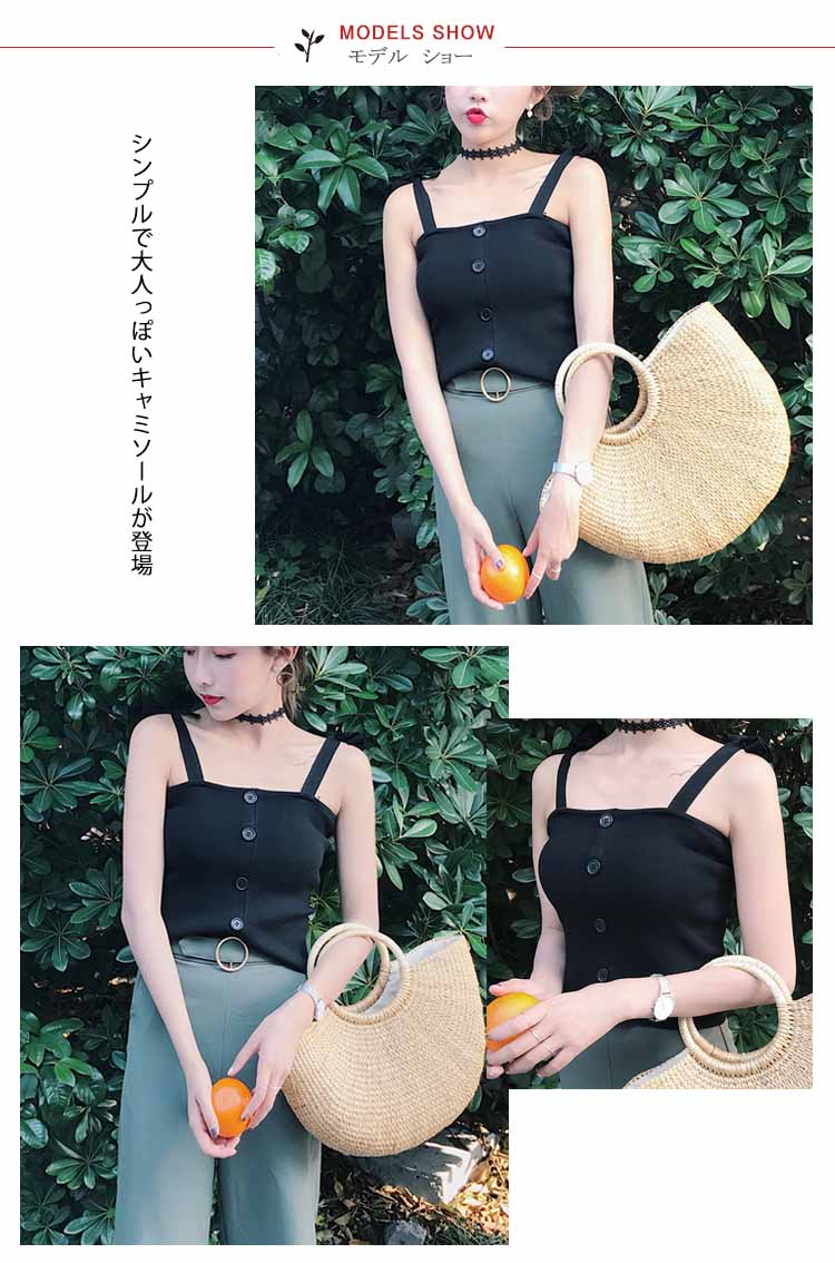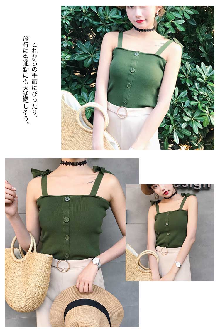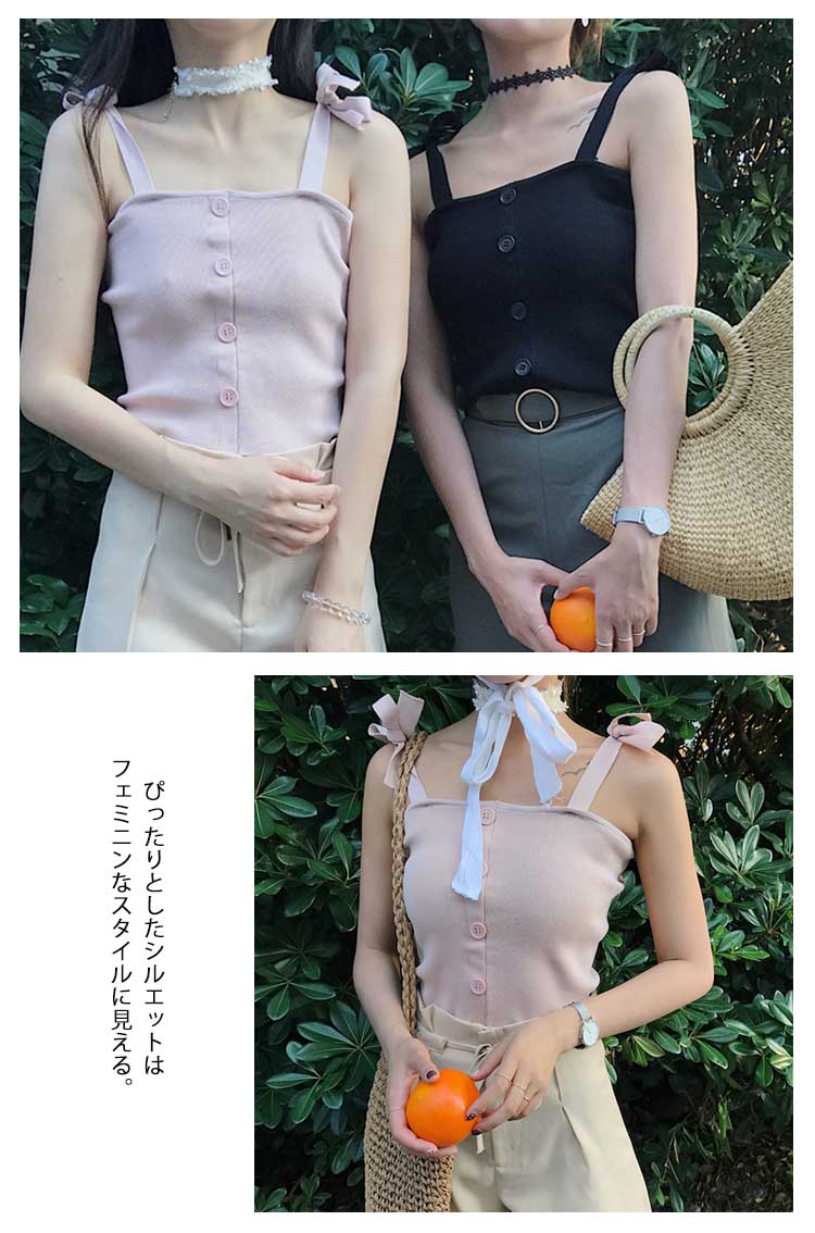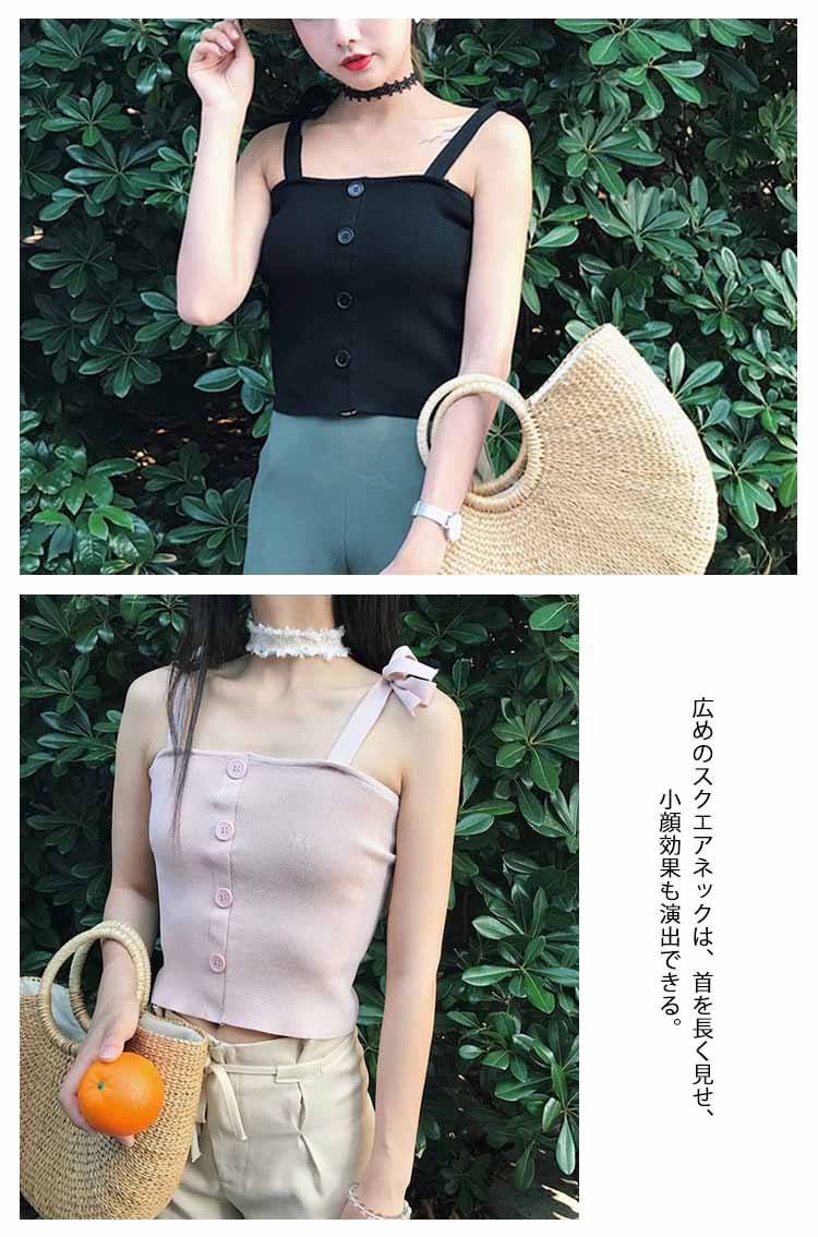 | シンプルで大人っぽいキャミソールが登場広めのスクエアネックは、首を長く見せ、小顔効果も演出できる。ぴったりとしたシルエットはフェミニンなスタイルに見える。フロントのシングルボタン、モノトーンなイメージを解消してくれる。これからの季節にぴったり、旅行にも通勤にも大活躍しそう。 | |