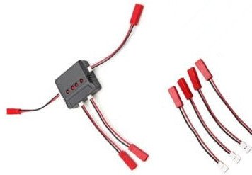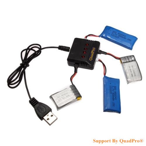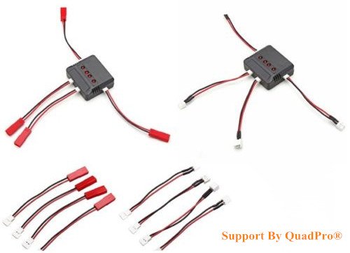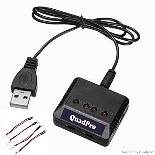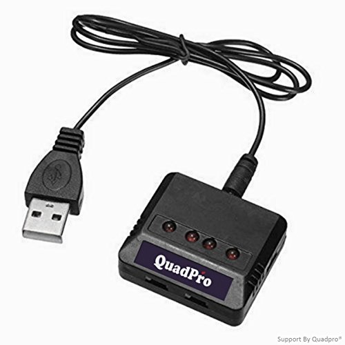 "Quadpro® Hobby RC Product Pro Supplier "Funny play to be Pro". Compatible RC Quadcopter battery: Hubsan: H107 H107L H107C H107D. Wltoys: V202 V252 V939. UDI: U816 U816A U830. JXD: 385 388 392. Syma: X5 X5C. FY: FY310 FY310B YIZHAN: X4. Holy Stone F180C M68 M68R(plus). JJRC: 1000A 1000B 5000. DFD: F180. This kind of charger can enable you to charge batteries on the same time and make your rc helicopters have enough replaced battery so that to have longer flying time. When the battery is charging, the light on charger lit. When finished, it will off automatically. Over charge protection and Short circuit protection Total Configures:1 charger, 1 USB cables,4 converting cables "Feature