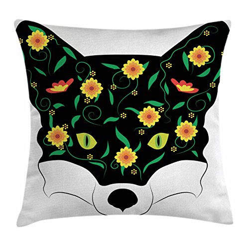 Fox Throw Pillow Cushion Cover by Ambesonne, Artistic Fox Portrait Face with Summer Meadow Flow...